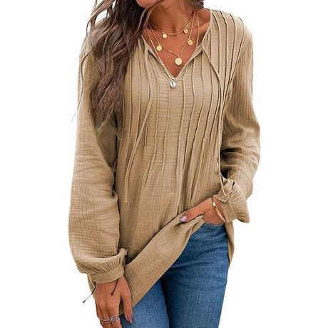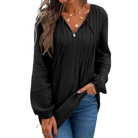 V-neck Pleated Textured Loose Pullover Top