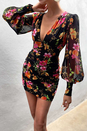 Women's V-neck Long Sleeved Pleated Slim Hip Dress