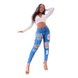 These high waist skinny jeans feature a trendy ripped design that adds an edge to any outfit. Made from durable denim material, they provide a comfortable and form-fitting silhouette. Elevate your fashion game with the button closure and upgrade your wardrobe with these versatile and stylish jeans.