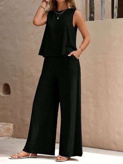 Round Neck Sleeveless Top and Wide Leg Pants Set